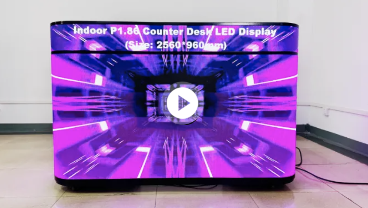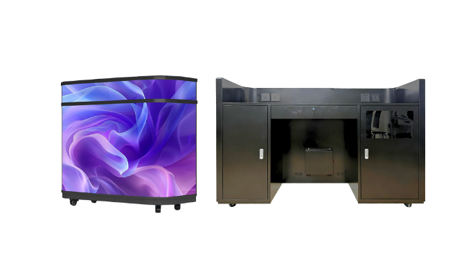 It’s a multifunctional digital reception desk that combines a traditional counter with a built-in LED screen. It’s used for brand promotion, digital signage, and customer engagement in retail stores, exhibitions, and corporate spaces.